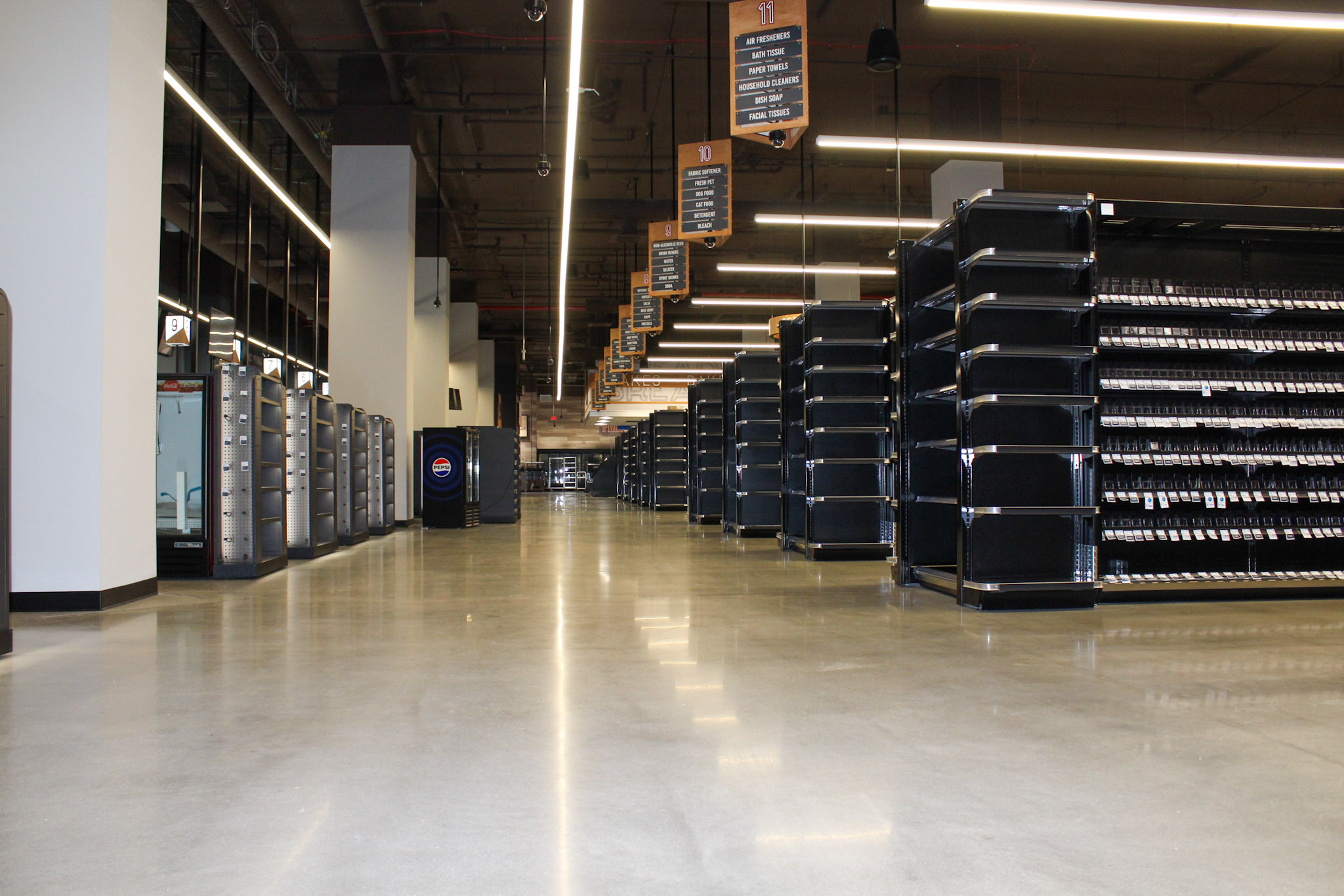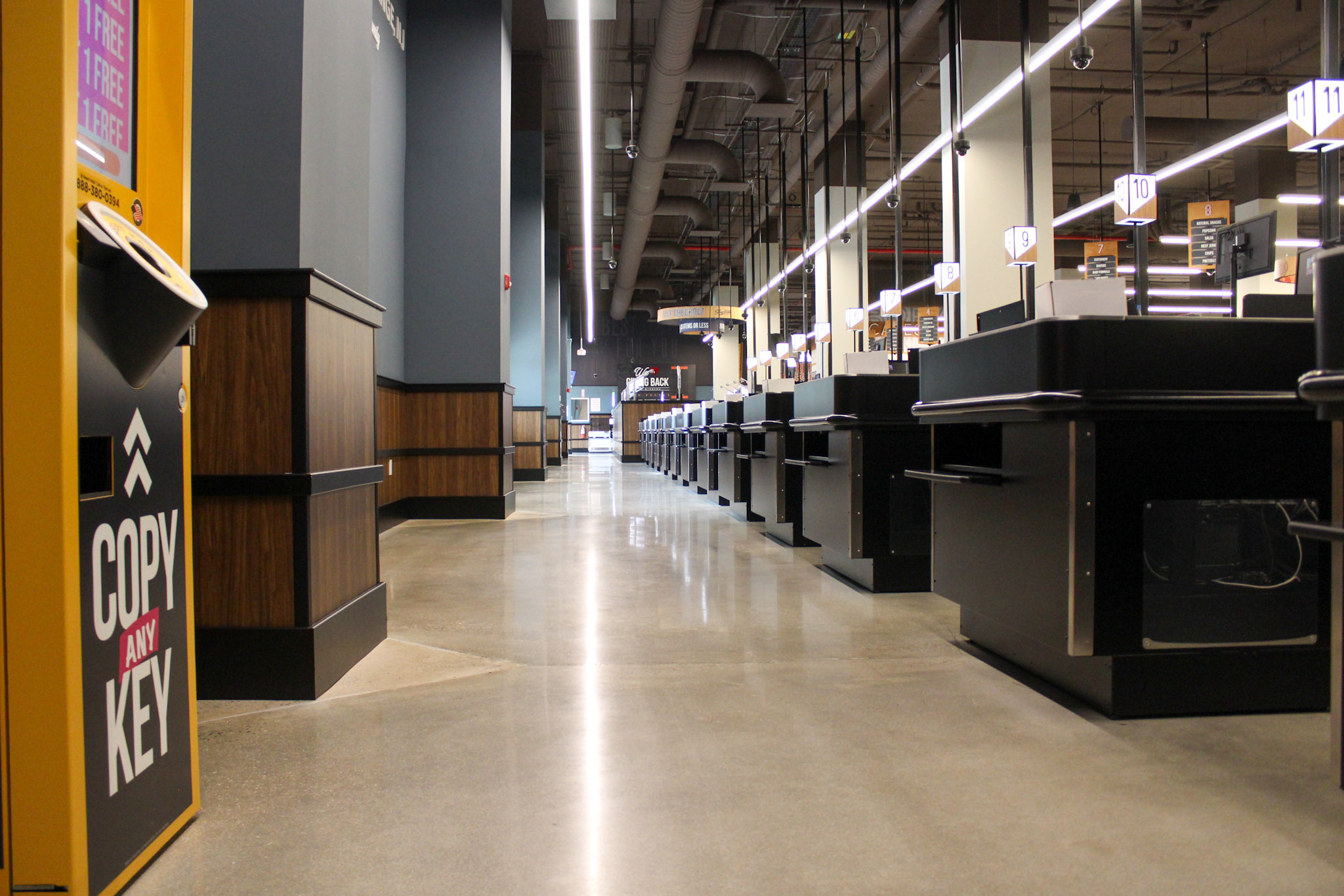 Installed with a 400-grit finish, this polished concrete provided a clean, reflective surface ideal for retail aisles. Its high light reflectivity enhances the shopping experience while lowering energy use, and its low-maintenance finish reduces long-term cleaning costs. - Grind and Seal – 10,700 sq. ft.